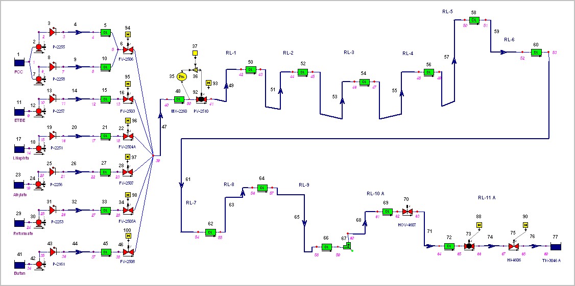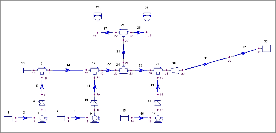 Abbildung 3: Netz mit 6 Stck. Produktpumpen, PID-Regelung zur Druckhaltung und Controller-gesteuerten Armaturen. Mit diesem Netz wurden die kavitationsgefährdeten lokalen Hochpunkte beim An- und Abfahren der Anlage untersucht und die erforderlichen Klappenstellungen zur Druckhaltung vorgegeben.