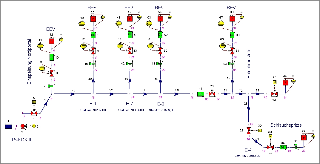 Abbildung 7: Netzmodell einer trockenen Löschwasserleitung mit Be- und Entlüftungsventilen (BEV) an den Entnahmestellen. Mit diesem Netz wurde der Primingvorgang simuliert. Die Berechnungsergebnisse haben gezeigt, dass zur Dämpfung der Druckspitzen beim Schließen der BEV´s nach jeweiligem Füllende der Leitungsabschnitte entsprechend dimensionierte Drosselblenden erforderlich wurden, um den Entlüftungsvorgang kontrolliert zu ermöglichen.